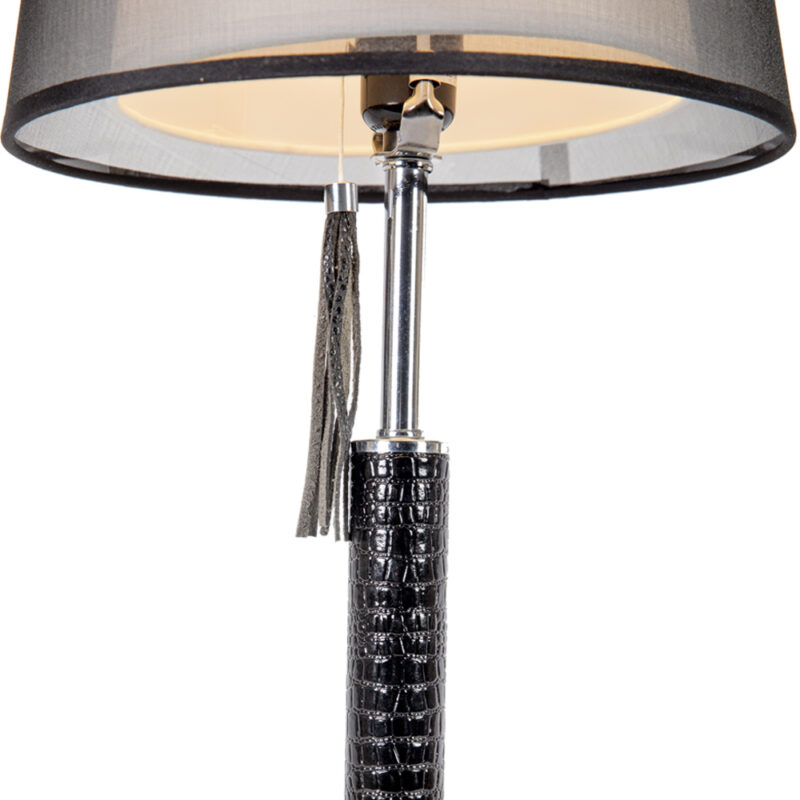 A Neoclassical Table Lamp stands on a Black base and has a crocodile Black leather arm that supports a double-layer Black & white shade, with a 28 cm diameter.