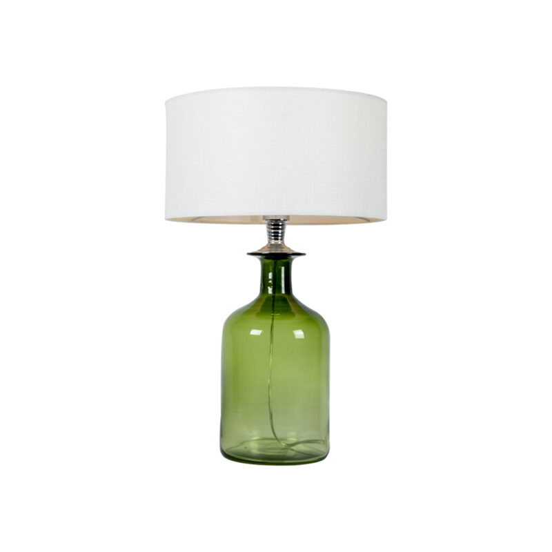 Vintage Table Lamp stands on a Green Glass Jar that supports a cylindrical white drum shade, with 39 cm diameter.