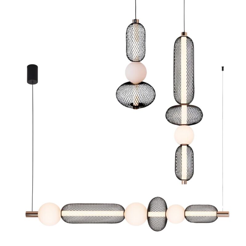 The ODD collection features a striking array of unconventional shapes crafted from metal, designed as net-like structures, and complemented by the soft glow of spherical milky glass. The metalwork is intricate, with organic, geometric, forms that create a sense of fluidity and movement.